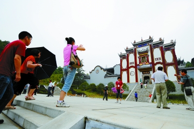 作为三峡湖北库区规模最大的地面文物复建工程,已有1000多年历史的屈原祠从此在紧邻三峡大坝的屈原故里秭归凤凰山上重生,与三峡大坝隔江水而望,遥相辉映,成了三峡库区的一道亮丽风景。图为游客在屈原祠的山门前留影。新华社记者 郝同前 摄