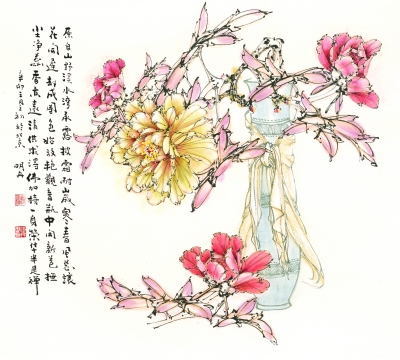 曹明冉擅长花鸟、山水、人物;尤以牡丹、双钩白描和诗词歌赋著称,他的作品多次入选重要的国际性艺术交流展,曾先后在香港、纽约、旧金山、吉隆坡、新加坡等地举办了以“牡丹”为主题的个人画展,深受国内外艺术爱好者和收藏家喜爱。