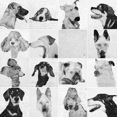 李军从2006年开始被这“独一无二的现代发明”所深深吸引,一直未曾间断地以宠物狗为题材,用一种别出心裁、别样韵味的水墨语言将他对宠物狗的凝视生动地逐一展现,为我们建构了一个前所未有的、意蕴丰富的宠物狗世界。李军的宠物狗世界没有背景,空荡荡、白茫茫……时空感、叙事性乃至作品的观念性内容的生成与传达,全都托付给狗的体态、眼神以及造就这体态与眼神的水墨运动(水与墨奇妙的混融、互渗、流淌),或说是由材质肌理生成的独特的视觉性语汇,因为李军有时也尝试用非水墨性材料作画。可以说李军的宠物狗世界基本上由一幅幅耐人寻味的宠物狗肖像构成。有人说肖像画是“压缩了的人物传记”,而李军的宠物狗肖像那各不相同的造型、姿态尤其是那让人过目不忘的动人眼神,确实不能不让人去用心揣摩、猜测它们背后太多的故事。很难说是狗的体态身姿与眼神使李军笔下的水墨运动余音袅袅、韵味无穷,还是李军笔下的水墨运动令宠物狗的体态、身姿与眼神获得了鲜活的生命意象,总之,空荡荡、白茫茫一片虚空之上的这些水墨的印迹、流痕奇迹般地获得了生命。这恰如古人所言“虚而为实,是在笔墨有无间”(清·方世庶),不用说这里自有一种一脉相传的水墨文化精神在。