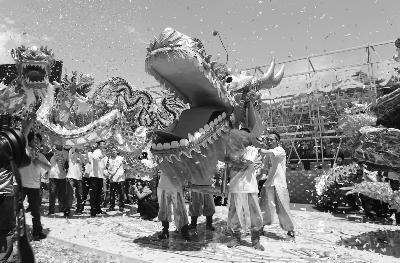 6月1日,“龙腾九塞、舞动神州”首届中国八达岭长城国际龙文化节在北京八达岭长城开幕。来自长城沿线地区的18支舞龙队将在八达岭一决高下,献上风格迥异的舞龙表演。本次文化节期间,还将举办“世界文化遗产保护与发展”高峰论坛和以“弘扬非遗”为主题的全国民俗文化展演展示等系列活动。图为开幕式现场的舞龙表演。本报记者 陈 曦 摄影报道
