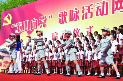 ▶5月31日,全国“童心向党”歌咏活动网上展播启动仪式在山东济南举行,此次活动由中宣部、中央文明办、教育部、团中央、全国妇联等联合主办,在活动中来自全国各地的儿童歌咏节目将依托中国文明网和新华网、人民网、光明网、中国广播网等进行网上展播,推动未成年人思想道德建设,增进未成年人爱党爱国爱社会主义的情感。图为济南市魏华小学舞蹈团在表演合唱《红星歌》。