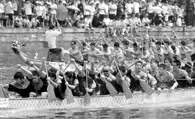 6月2日,第四届中国·枣庄海峡两岸龙舟邀请赛在京杭运河山东台儿庄古运河上举行。来自浙江、澳门、台湾等地的23支代表队参加了大龙舟300米直道竞速赛。图为龙舟竞技现场。(新华社发)
