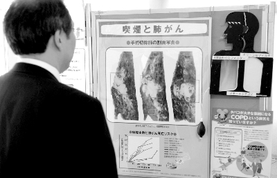5月31日,是世界无烟日。日本东京涩谷区区政府通过张贴海报、举办展览等形式向人们宣传吸烟的危害。图为在日本首都东京涩谷区区政府,一名男子参观禁烟展览。(新华社发)