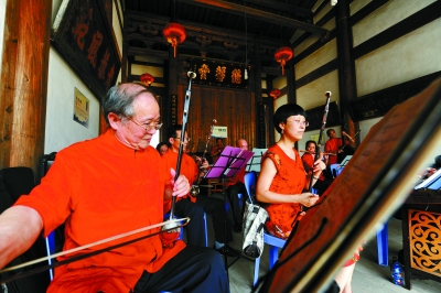 端午节将至, 6月4日,悠扬的乐曲——十番古乐回荡在福建省福州市榕城古街三坊七巷,为这里营造浓浓的节日气氛。“十番”是福州古老的地方音乐,被列入首批国家级非物质文化遗产名录。图为福州民间乐团艺人在演奏十番乐曲。新华社记者 张国俊 摄