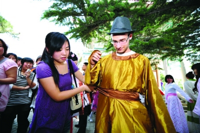 6月5日,汉文化爱好者们来到山东省烟台市的南山公园栖云阁,身着传统的汉服,按照传统举行了祭祀屈原和派发五彩绳活动,迎接端午节到来。图为一名外国游客试穿汉服。(新华社发)