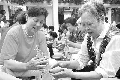 6月5日,山东省枣庄市市中区中心街街道铁西社区在举办的首届邻里节活动中,开展了“包粽子”比赛。社区120多名成员汇聚一堂参加比赛,在欢声笑语中迎接端午节的到来。图为正在比赛的社区居民。吉 喆 摄