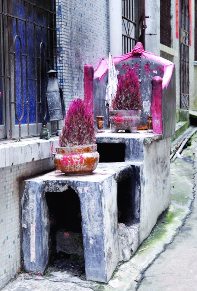 民间崇拜的形式也很多样,如今仍然流传的有社公崇拜和门神崇拜。根据《左传·昭公二十九年》记载:“共工氏有子曰句龙,为后土……后土为社。”社,也就是土地神,北方俗称土地爷。北海粤语保留了许多古汉语词汇,仍把土地爷称为社公。珠海路老街上多处可见祭拜社公的场所,逢年过节,老人们便拿着家中的鸡鸭鱼等作为祭品拜祭社公。而门神崇拜就更为常见,在广西的北海、合浦等地有守门神的习俗,元宵夜富贵人家贴出的门神常常被人涂掉眼珠,所以他们还要安排专人守夜。现代老街居民已经不守门神,但几乎家家户户仍张贴门神,以此来祈求平安。老街几乎所有商铺的“铺窗趸”下都供奉着一处门官神位,店主早晚焚香,祈求门神保佑事业兴隆。