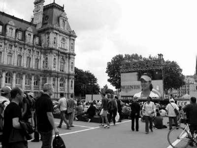 正值赛事越来越激烈,球迷热情日渐高涨之时,巴黎市政府举办的“罗兰·加洛斯进城”活动在巴黎市中心向人们敞开大门。在市政厅门前广场,铺设了红土色的迷你式网球场,55平方米的巨大屏幕对法网精彩赛事进行直播。在为期9天的活动中,人们携亲朋好友免费入场,在此观看比赛、分享激情、体验网球乐趣、感受以网球为主体的节日般的独特氛围。湛蓝的天空﹑红土色的球场﹑运动着的男女老少,以古老典雅的市政厅建筑为背景,构成了一幅多彩的都市风景画。