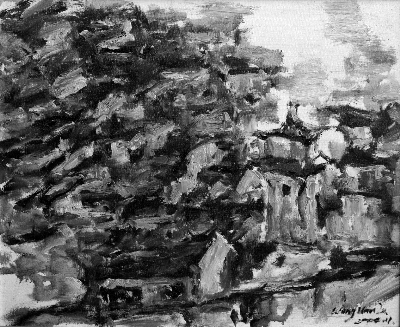 皖南的古宅民居一直以来都是中国古建筑的杰出代表,高墙深院,层楼叠瓦,处处是景,步步入画,再加上皖南民宅大多依水而建,与旖旎的湖光山色交相辉映,本身就是一幅幅绝妙无比的山水画。王汉乐笔下的皖南古民居,黑瓦白墙几乎充斥了整个画面,墨彩斑驳淋漓,近乎抽象,既有中国画大写意的酣畅,又有着西画的理性厚重,看似混乱的笔触中民居的形状不再重要,真正直抵人心的是那一丝丝从中透出来的现代人类对心灵家园的追寻,对宁静质朴生活的向往。看王汉乐的油画,时不时会有一种恍惚,仿佛那些古老的屋舍都幻化出了活生生的生命,扑簌簌地走到你的面前,一种诗化的意韵油然而生。其实,从另一个角度来看,抹去了光影的具体变化,融入中国传统绘画的写意式效果,这未尝不是画家试图站在中西方艺术交汇点上的一种尝试。
