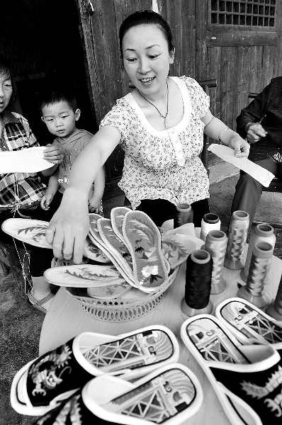 湖北省宣恩县沙道沟镇是土家族聚居区之一,土家刺绣原是土家姑娘必须掌握的生活技能,但随着社会的发展,土家刺绣逐步被遗忘,其技艺濒临灭绝。2005年,土家族妇女周银菊办起了集设计、生产、收购和销售于一体的手工绣花厂,组织农妇进行培训,目前已有400余名农妇熟练掌握了土家刺绣技艺。图为当地妇女在展示自己亲手制作的绣花鞋。(新华社发)