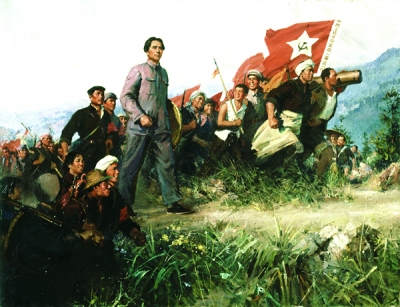 1927年9月,中国共产党在湖南、江西边界领导发动农民武装起义。“八七会议”后,毛泽东受中共中央的委派,以中共中央特派员的身份前往长沙,领导湘赣边界的秋收起义。8月18日,改组后的湖南省委在长沙市郊的沈家大屋召开会议,讨论制定秋收起义的计划。毛泽东在会上着重阐述了“枪杆子里出政权”的思想。会议决定要与国民党彻底划清界限,旗帜鲜明地以中国共产党的名义号召群众,并确定集中力量在湘东赣西发动以长沙为中心的武装起义。9月9日,湘赣边界秋收起义按预定计划爆发。油画《秋收起义》历史地再现了一代伟人毛泽东面对国民党的黑暗统治,高举革命旗帜,率领工农革命军,义无返顾地与国民党反动派进行坚决斗争的战斗英姿。