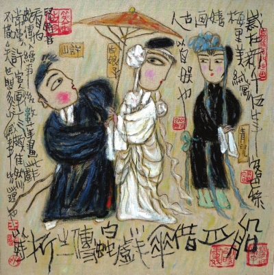 王以时酷爱中国传统戏剧,在空间有限的舞台上,演员们身着华美的戏服,在精准的动作中才华毕现。王以时在画布上捕捉最美的瞬间,抓住完美的结构形态,以此展示人物关系和刻画个性,画面简洁明快、内容丰富。