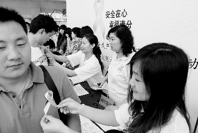 6月13日,北京市海淀区文化娱乐场所安全生产月“黄丝带行动”启动。该活动由北京市海淀区文化委员会主办,为期一个月,包括一系列安全教育活动。图为当日北京市海淀区文化委员会工作人员为人们戴上寓意平安的黄丝带。新华社记者 张 旭 摄