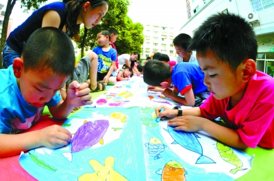 ◀ 6月8日,四川省南充市顺庆区金红国际幼稚园开展“描绘心中海洋”绘画比赛活动,旨在让小朋友们通过绘画比赛了解海洋知识,从小树立爱护海洋的意识。图为小朋友在长卷上作画,描绘心中的海洋。(新华社发)