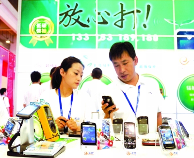 6月16日,第九届中国国际软件和信息服务交易会在辽宁大连开幕。本届展会面积为3.5万平方米,同期会议活动40多项,中外参展厂商超过750家,海外参观参会团组覆盖20多个国家和地区。图为观众在第九届中国国际软件和信息服务交易会上体验一款智能手机。(新华社发)
