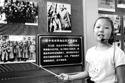 ◀ 被命名为“中国工农红军延安育才红军小学”的延安育才学校,常年开设个性课堂,让学生在张扬个性的同时传承传统文化,并接受红色教育。图为一名小学生讲解员在校史陈列室向到访者讲解革命时期的延安第一保育院。新华社记者 陈昌奇 摄