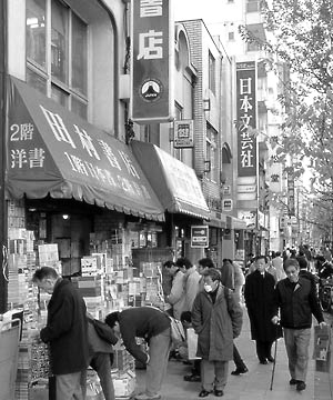 去神保町,无需选什么良辰吉日,在周末反嫌人多。它位于东京都的中心地带,地段好得不能再好,交通便利,信步可达。这样一个集中了150余家各式书店的书店街,正体现了日本人读书爱书的情结。在鳞次栉比的书店里,大的有几层楼,小的只一个门面房。通常的旧书店只有30平方米左右,门口是几个特价书柜,进门之后是纵向四排书架,最里面是店主的柜台,整个店里仅留一条很窄的U型通道供购书者移动,所有架子上的书都是从地板一直堆到天花板。这种简单甚至可以说简陋的布置,给人一个极其强烈的印象:这是真正供读书人和爱书人使用的书店。