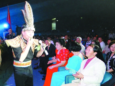 6月9日晚,由中国驻菲律宾使馆、菲华各界联合会及菲律宾外交部联合主办的“友谊长青”庆祝中菲建交36周年大型文艺晚会在菲律宾国际会议中心上演。由中国文化部选派的贵州民族歌舞剧院的艺术家们为观众献上了一台精彩纷呈的演出。图为侗族小伙用树叶吹奏菲律宾歌曲《为了你》。(霏 霏)