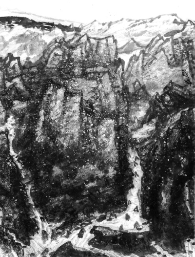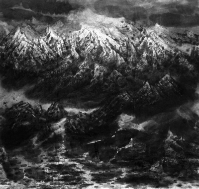 李小可(李可染艺术基金会理事长):李宝林是我父亲李可染非常喜欢的学生,“大山回响”有两重意义,一是他的绘画带着李宝林对东方文化、山水画的一种文化责任,比如说对于传统与现代的问题,如何使中国历史悠久的山水画能够继续发展和繁荣,这实际上是几代艺术家所面临的共同的问题,“大山回响”实际上也是包括李宝林在内的一群山水画家所提出的一个课题。他的带有半抽象的文化符号、泼墨、黑墨和简单的线条的丰富性追求,有一个不断探索的过程。他现在讲大写意,不仅仅是一个口号,而是需要各种条件来支撑,这种条件是对传统的多元理解,也包含了对视觉结构的抽象理解。二是他的绘画中一直想表现大西北苍茫的雪山,这是他心里的大山。他去西藏肯定没我去得多,但他表现的境界、深度超过我们这些去过的,实际上是他把客观的山和他心中的主观感觉、笔墨语言结合起来,产生了这种大山,而这种大山体现着苍茫、圣洁,又难以名状的感觉。所以我觉得他将这三者结合得比较好,其艺术语言是在反复实践中产生的,开始线条可能还比较简单化,但经过锤炼后感觉非常浑厚。