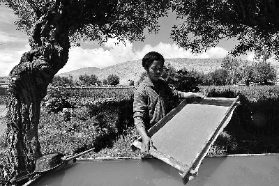 尼木藏纸是西藏传统的三大藏纸之一,生产历史悠久。尼木藏纸的主要原料是狼毒草的根,颜色米黄、有光泽、稍厚,在阳光下隐约可见草根纹路,强度高、天然防蛀、防腐、不变色、不易撕破。西藏有很多用尼木纸印制的文史经典,至今已保存千余年仍完好无损。图为造纸艺人格桑丹增用纱网将纸捞出。新华社记者 陶希夷 摄