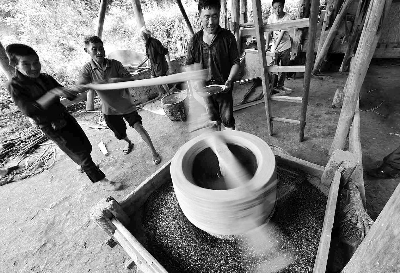 位于湖北省宣恩县李家河乡箭竹坪的一座土家油榨坊,是宣恩县境内仅存的、也是仅用于“表演性”榨油的油榨坊。因其榨油工序繁琐,加之出油率较机械榨油要低很多,这种在上世纪六七十年代还十分红火的土法榨油作坊,迅速淡出人们的生活。图为村民用石磨将油菜籽碾破。 (新华社发)