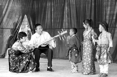 7月27日,拉萨市嘎玛贡桑统建社区学前班的16名孩子完成学前培训,即将走进小学校园。这个公益性学前班让412名学龄前儿童免费或半免费接受学前教育。图为在该学前班义务支教的西藏大学的学生和孩子们一起表演节目。新华社记者 文 涛 摄