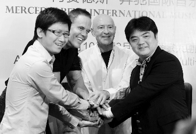 8月10日至14日,“艾森巴赫大师系列音乐会”将登陆国家大剧院。艾森巴赫是当今乐坛德高望重的一流指挥家。他是乔治·塞尔和赫伯特·冯·卡拉扬两位指挥泰斗的弟子。此次音乐会他不仅首次携手国家大剧院音乐厅管弦乐团,为观众带来马勒《第一交响曲》、德沃夏克《狂欢节序曲》等经典曲目,还将与中国打击乐演奏家李飚共同为观众献上作曲家郭文景的打击乐协奏曲《山之祭》。图为艾森巴赫与李飚等艺术家齐聚国家大剧院。本报记者 喻非卿 摄影报道