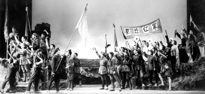 于是我们看到,在第一幕《蛇江激战·突重围》中,在阻击敌军、掩护主力红军过蛇江的激战中,“泰山营”鏖战三昼夜,伤亡惨重、弹尽粮绝,与敌人展开了肉搏战。马营长牺牲前悲壮地喊道:“毛主席,快来挽救红军呀。”配合这一幕的则是另一句经典台词:“枪是昨天的枪,人是昨天的人,为什么昨天打胜仗今天打败仗?”然后,剧情转入第二幕《遵义春晓·不眠夜》,毛泽东重新回到军事指挥岗位。