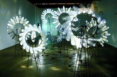 展览第二部分“临界之境”以人工生命、智能物体、杂交物种作为新的自然对象,探讨这些处于临界状态的生命雏形如何以多元的样式呈现各自独特的活力。展览第三部分“悬迫之域”将生命赖以依托的生态环境引入焦点,以艺术的启示来唤起人们对环境破坏和生态失衡的关注。来自克罗地亚的艺术家依娜的作品《柠檬的诗》用1000个柠檬作为发电的能源,为观众提供了一个实验性的平台,用新型机械和生物体来创造诗歌和文学作品。艺术家海伦的作品《臭氧北京》,将北京空气质量的分析数据转化为视觉和声音的时空连续。一团由电脑生成的云悬浮在城市图片的上空,凝聚着持续变换颜色,反映了空气中二氧化氮、二氧化硫、臭氧和灰尘颗粒的浓度。作品通过思考空气质量信息与环境污染之间的关系,成为揭示一个城市生态的手段。