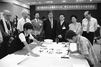 8月4日,第27届成田山全国竞书大会中日友好少年少女书法交流会在北京举行,来自山东、河南、甘肃的16名爱好书法的中小学生和来自日本的16名学生一对一切磋书艺,著名书法家刘艺、林岫、高木圣雨现场为孩子们讲评了书作。日方代表团还向中国书法家协会赠送了赈灾物资感谢牌。