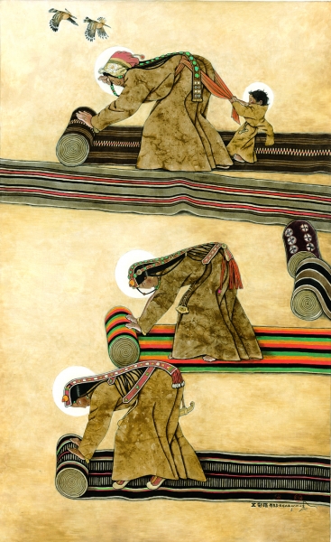 此次展览上,藏族画家的共同出场还带来了一个独特的绘画概念——布面重彩。由于藏地特殊的自然条件,利用矿物颜料在布上而非宣纸上作画,成为这些藏族绘画的一个特色。为编织藏族民俗画卷不遗余力的计美赤烈向记者介绍说,在创作时,他会用到西藏的青茶和矿物,磨成颜料来创作。他还巧妙地运用了装饰变形画法,使得画面热情洋溢。他认为借此来表现西藏风土人情是最合适不过的。作为参展的4位唐卡艺术家中最年轻的一位,夏鲁旺堆虽然年纪不大却已从艺多年,他的少年时期是在拥有大量国宝级壁画的著名寺院夏鲁寺度过的,寺院主持夏鲁格桑就是一位传统绘画大师,这段经历深刻影响了他的艺术志向。还俗以后,旺堆专心致志从事唐卡创作与授徒。展览中唯一的一位女性画家德珍,家境殷实,仿佛用绘画书写童话的天真女子。她的画很卡通,也很原生态,她用画中随处可见的美丽大眼睛看世界,看到了美丽心灵无处不在。据说,她曾经教会盲童画画,帮助他们用心灵感受光明。
