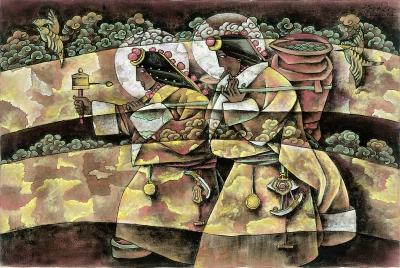 从这些藏族艺术家身上,折射出各种优秀文化传统的影响,也反映了汉藏艺术长期以来的交融和发展。参展的汉族艺术家韩书力自从几十年前踏上了西藏这片土地就再也没有离开过,画家余友心也从80年代开始把生活、艺术的全部重心都移到了那里。展览的策划人之一李小可,更是无数次地到那里朝圣、寻觅,并致力于将更多西藏之美传播到更广阔的空间,这是他继2004年“雪域彩练”后策划的关于西藏当代绘画的第二个专题展览。