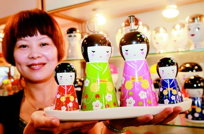 8月13日,在北京中国国际展览中心举行的2011中国国际妇幼婴童产业展览会暨轻工精品展览会上,来自广东潮州一家公司展出的卡通厨房用具吸引了参观者的眼球。图为工作人员展示卡通人物造型的食品调料套装。(新华社发)