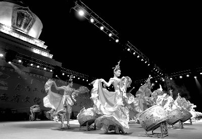 8月18日,“春雨工程山西文化志愿者边疆行”在内蒙古自治区呼和浩特市开幕。图为山西吕梁民间艺术团演员在表演舞蹈《欢歌鼓舞晋蒙情》。本报记者 卢 旭 摄