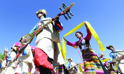 8月26日,西藏日喀则地区第九届珠峰文化旅游节开幕。为期3天的文化旅游节除进行群众文艺表演外,还将举行民族手工艺展、物资交流、招商引资等活动。图为西藏日喀则农民在开幕式上表演传统舞蹈。