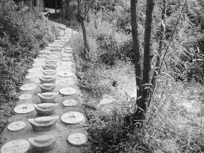 位于半山腰的“淘金洞”是古淘金洞遗留下来的洞穴,深达几百米,十分罕见。提起裤脚行走在昏暗幽长的洞穴中,洞内凉风习习,清泉外溢,听着叮咚作响的天籁之音,人仿佛一下子回到了远古。不知是曲阳人历来崇尚富裕,还是本就天生精巧,不知从何年何月开始,曲阳兴起了石雕业。雕塑大多与钱财神佛有关,随处可见大块石头雕刻的黄金袋、宝葫芦、金元宝、弥勒佛送宝、罗汉雕塑等,精美细致,惟妙惟肖,刚进山时我们就亲近了一条“千米亲水步游路”。这是一条平坦的弯弯曲曲的水泥路,路一边是小溪,一边是山体,路中间砌有无数个雕刻精致的枕头般大的元宝,两边是两行大小相间的铜钱雕刻。半拃深的泉水浸润着这些“财宝”,使它们越发显得玲珑剔透、诱人。人们的双脚踏上去,再认真地走一趟,仿佛那财宝就被招进家门了。