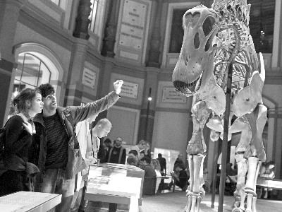 8月27日,德国首都柏林举行“博物馆长夜”活动,从当日18点到次日凌晨2点,共有105家博物馆向公众开放,各家博物馆还举行音乐会、舞台剧、电影放映等丰富多彩的活动,给公众一个和博物馆全方位亲密接触的机会。图为观众在柏林自然历史博物馆观赏恐龙骨架化石。新华社记者 马 宁 摄