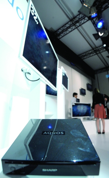 8月25日,夏普公司在日本东京举行新品发布会,推出8种无线天线电视机。在使用电视机时,使用者可以按照自己的喜好,便利摆放、移动电视,无线接收电视信号。图为新推出的无线路由器(前)和一款无线天线电视机(后)。(新华社发)