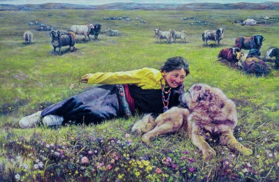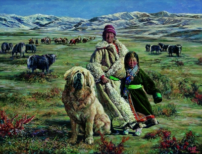 中国的青藏高原是藏獒繁衍栖息之地,一个个古老的美丽传说为这片土地蒙上了一层神秘的面纱……林跃画笔下的藏獒就来自这片雪域高原。林跃说,藏獒在这片自然生态恶劣的环境中,倔强地繁衍生息,历数千年而不改其原生态秉性,这本身就是一个令人惊喜的生命奇迹,藏獒已经成为生命与自然和谐生存发展的活化石。对此,林跃的感受非常人能比,因此,才有了他画笔下形态迥异、仪态万千的藏獒。