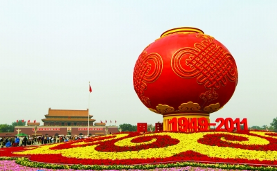 9月27日,北京天安门广场主题为“祝福祖国”的中心花坛摆放完毕,盛装亮相。中心花坛主体是一只喜庆的大红灯笼,灯笼上镶有传统的中国结,南北两侧分别立有“1949—2011”“祝福祖国”等字符,灯笼下则是花草组成的祥云图案。整个花坛直径50米,高度为15米。本报记者 陈 曦 摄