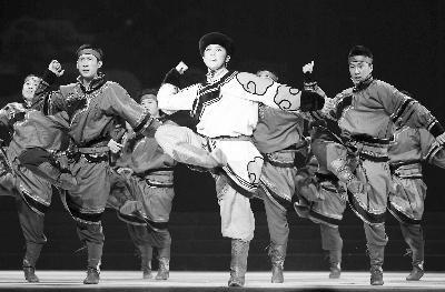 10月7日,作为2011广州艺术节展演节目,由内蒙古民族歌舞剧院创排的大型蒙古族舞剧《诺恩吉雅》在广州军区礼堂上演。该剧通过激烈的戏剧冲突和极富魅力的民族音乐、民族舞蹈,塑造了一对追求自由婚姻的科尔沁蒙古族青年形象,展现了浓郁的科尔沁民族风情。图为演出剧照。本报记者 卢 旭 摄影报道