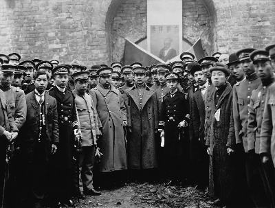 孙中山等谒祭明孝陵,南京,1912年2月15日 孙中山在清帝退位3天后,着一身戎装携南京临时政府官员谒祭明孝陵。前排左三为南京临时政府南京卫戍总督徐绍桢,左四为陆军总长黄兴,左五为临时大总统孙中山,左六为海军总长黄钟瑛,左七是教育总长蔡元培。一个月后,临时政府即宣告解散。佚名 摄 香港历史博物馆 藏 |