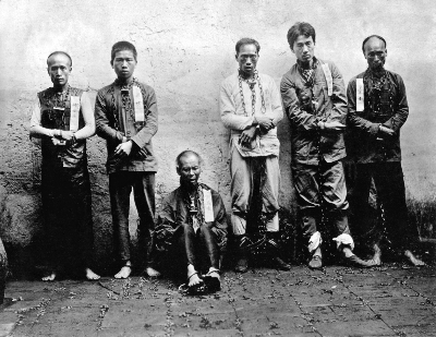 临刑前的黄花岗烈士,广州,1911年4月 照片中每人胸前都挂有写着名字的纸条,左起分别为陈亚才、宋玉林、韦幺卿、徐满凌、梁伟、徐亚培。但实际上只有徐满凌一人的名字可在黄花岗烈士陵园中找到,也有资料认为这些名字多系化名,甚至有人认为右二即林觉民。 施塔福 摄 上海市历史博物馆 藏 |