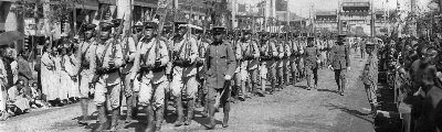 ▼ 准备南下武汉的清军部队,北京,1911年10月 在获悉武昌首义的消息后,清廷立刻派陆军部大臣荫昌率领新军前往弹压。这是北京的新军正通过东四牌楼前往前门车站。和旁边的巡警、民众比起来,这支队伍明显高大很多,整齐的队列也显示出这支部队相对训练有素。 施塔福 摄 上海市历史博物馆 藏 |