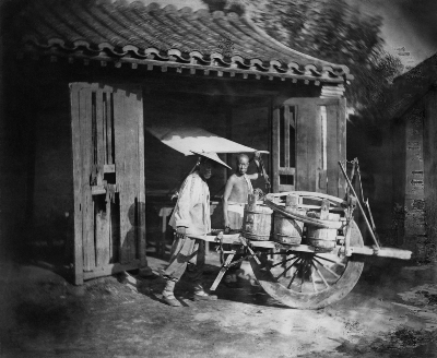 夏日的运水工与小型运水车,北京,1861年 后面的房子为水井所在处,北京俗称“水窝子”。 佚名 摄 伦敦传道会、世界传道会档案馆、英国伦敦大学亚非学院 藏 |