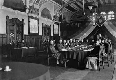 南北议和会议,上海,1919年2月20日 南北议和会议在上海德国总会召开,南方军政府代表为唐绍仪,北京政府代表为朱启钤。由于南北议和有碍日本在华利益、有悖段祺瑞“武力统一”中国的意图,北京政府只是迫于中外压力才同意,因此和谈注定只能以失败而告终。图为会议现场。 亚细亚照相馆 摄 中国第 |