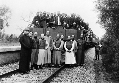 京张铁路修成时詹天佑与同事合影,1909年2月 京张铁路是中国首条由中国人自己筹资、勘测、设计、施工建造并投入营运的铁路,由詹天佑(车前右第三人)任京张铁路会办兼总工程师,1905年9月开工修建,于1909年建成。佚名 摄 |