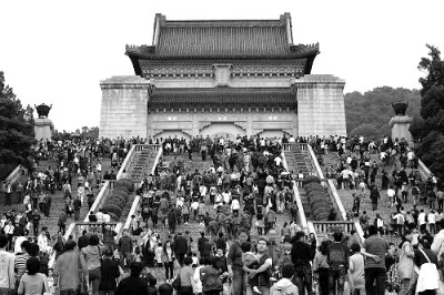 南京东郊中山陵,从1929年开始,孙中山永远地安息在这里。从景区正门到先生的安息之地,要走392级石阶,表示当时三亿九千两百万中国人民对孙中山的拥戴。整个墓区平面形如大钟,石碑上篆刻着先生“革命尚未成功,同志仍须努力”的嘱咐,三门牌坊上刻着“博爱”两个浓缩孙中山精神实质的大字。走出孙中山的墓冢,沿着通幽曲径,经中山书院,到曾经的藏经楼、如今的孙中山纪念馆,一路可见瞻仰先生的人不断往来。陵园路全长16公里,堪称是南京城市道路建设史上最早、最标准的大手笔杰作。现在路上浓密的树冠构成的绿色通道,仍是南京一道最亮丽的风景线。