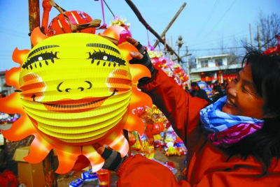 龙年元宵,山东省枣庄市山亭区乡间大集上的花灯市场热闹非凡,龙灯、卡通灯、动感灯等花灯式样繁多、琳琅满目,吸引了众多农民和市民前来参观选购。图为当地农民在大集上选购花灯。(刘明祥 摄)
