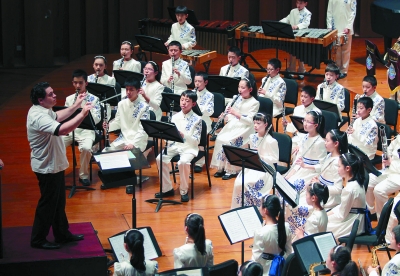 今年的青少年艺术周演出首次扩大到10场,来自北京市各区县21所大中小学的千余名“小艺术家”登上国家大剧院的舞台。图为北京第二实验小学金帆管乐团在演奏。